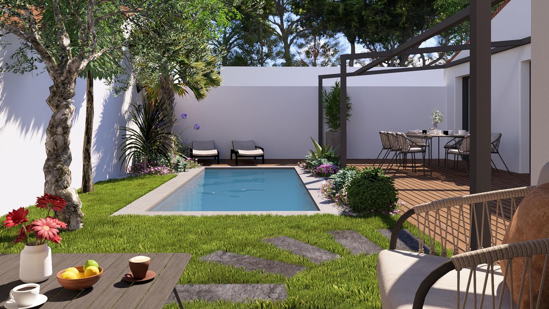 Ce projet transforme un petit jardin côtier en un véritable havre de détente grâce à l’intégration d’une mini-piscine élégante et parfaitement proportionnée.