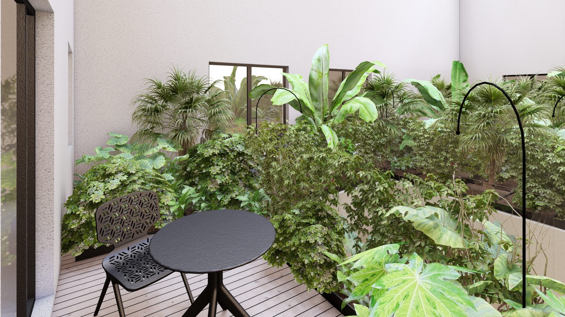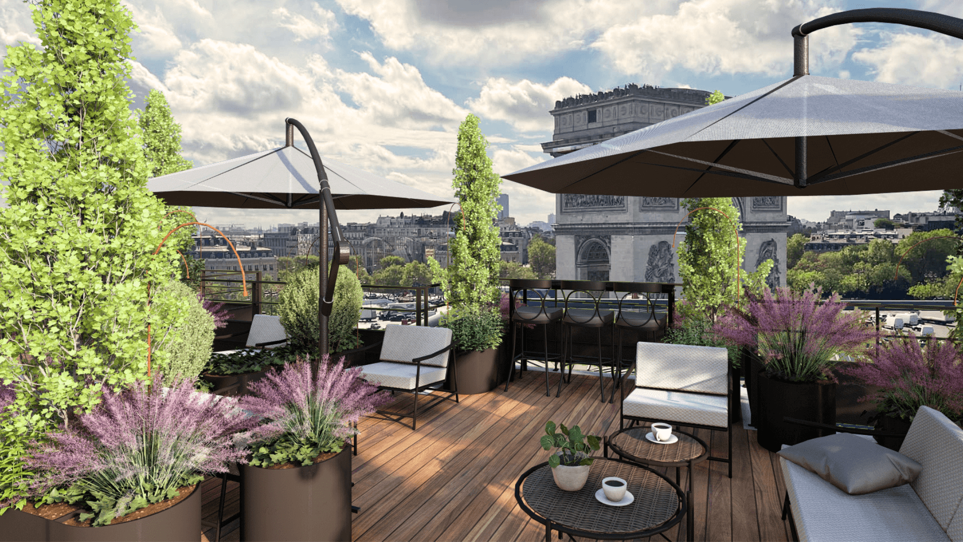 Une terrasse paysagère contemporaine offrant une oasis de verdure au cœur de Paris, près de l’Arc de Triomphe. Lignes épurées, matériaux sobres et végétation délicate créent une ambiance apaisante et raffinée. Mobilier minimaliste et perspectives ouvertes sur les monuments invitent au confort, à la contemplation et au bien-être.