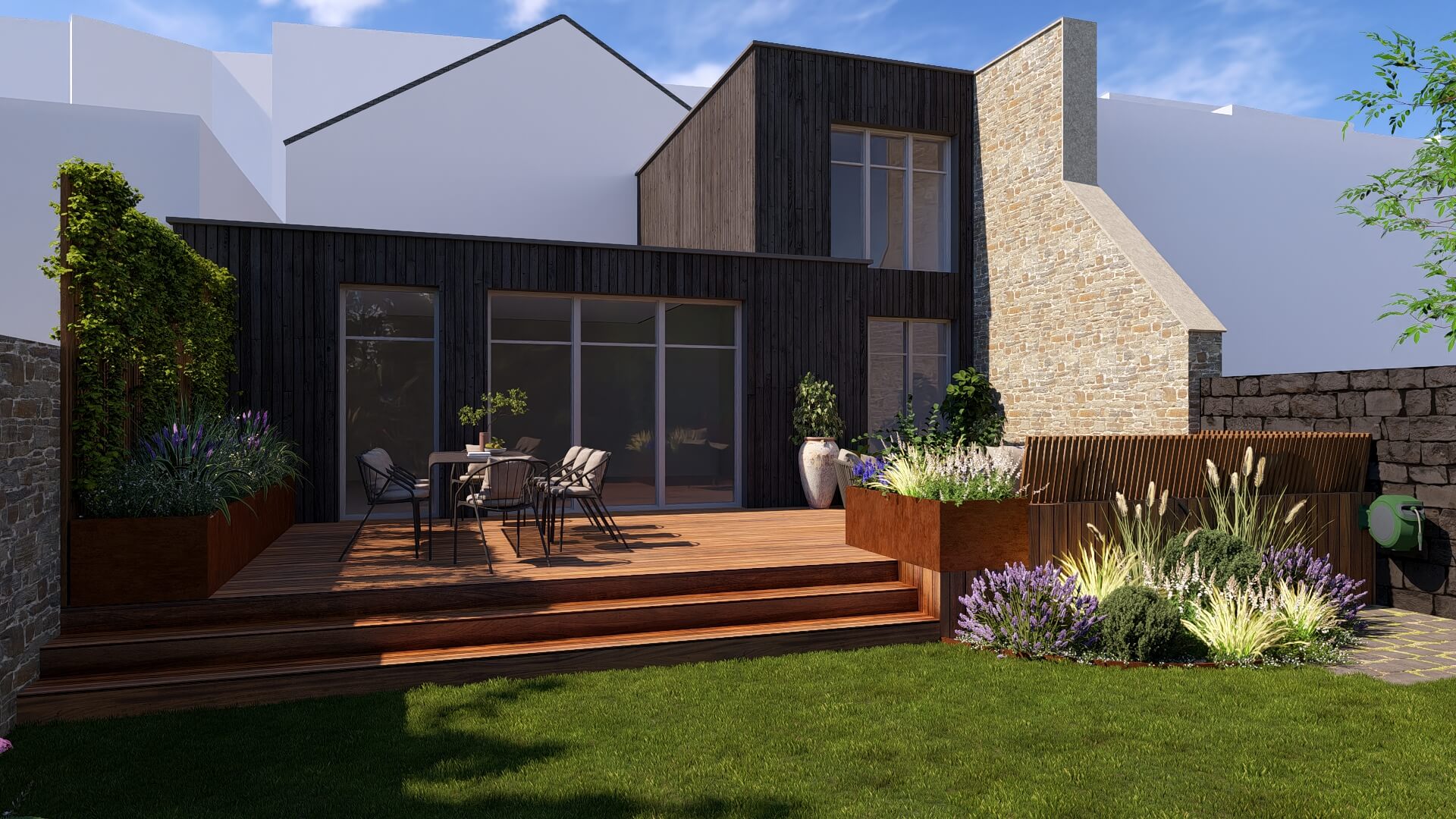 Terrasse en bois, pavés engazonnés et jeux de lumière créent une atmosphère douce et chaleureuse. Graminées, vivaces et sculpture en corten signent un jardin à la fois intime, artistique et vivant.