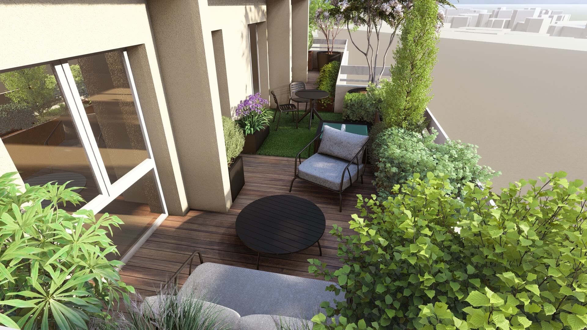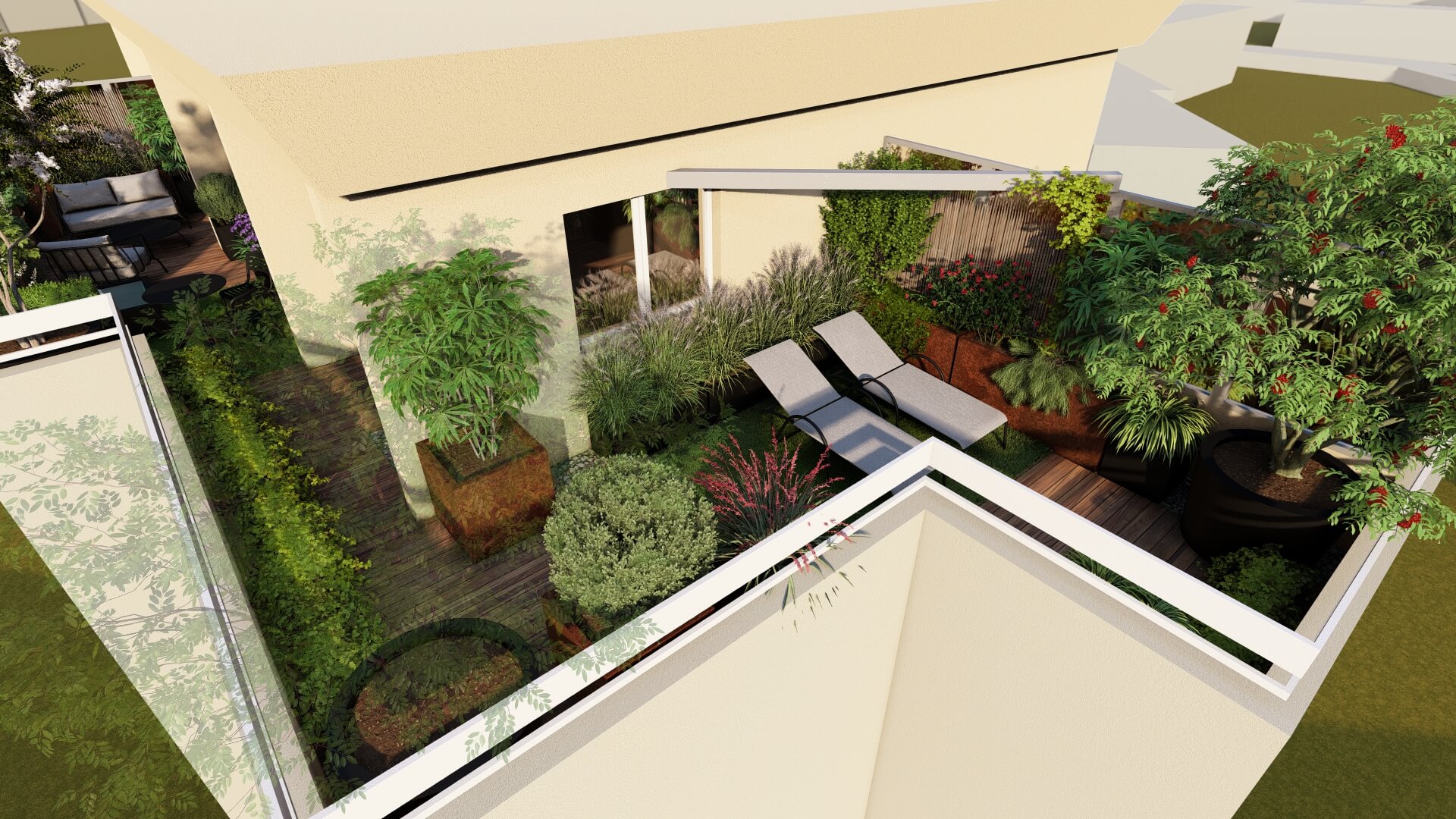 Un jardin suspendu contemporain où bois, végétation et mobilier minimaliste créent un espace élégant. Différentes ambiances – salon, coin repas, détente – offrent un équilibre parfait entre design et nature. Un cadre raffiné en hauteur pour se ressourcer loin de l’agitation urbaine.
